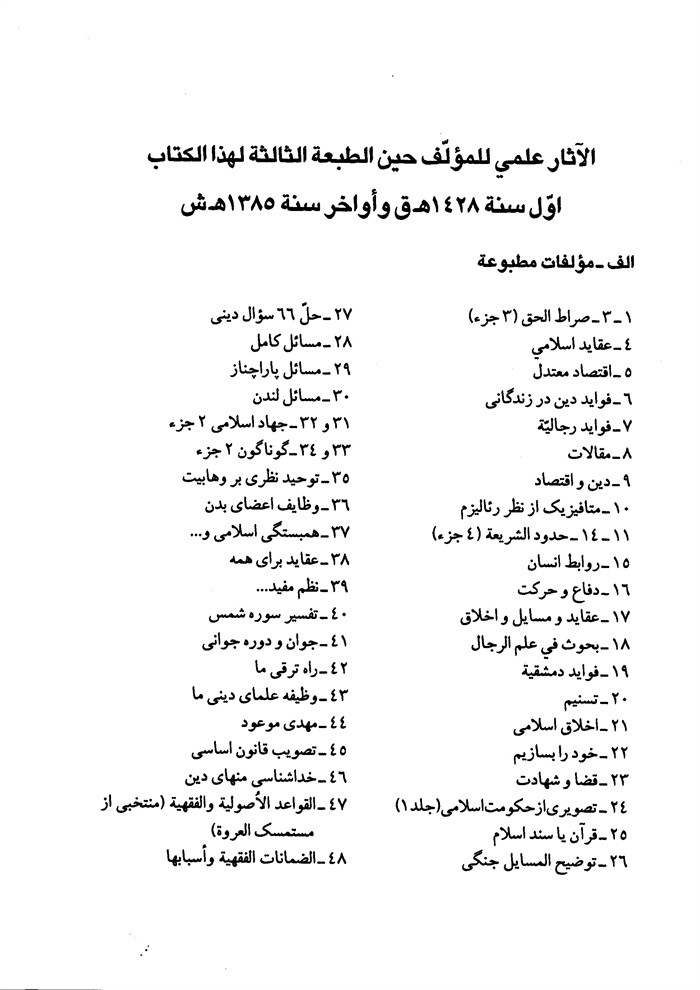 و قد صادف تجديد طبع هذا الكتاب انتصار ثورتنا الاسلامية. في بلادنا افغانستان بيد أنّ اعداءنا في انحاء العالم يتآمرون علينا و يواصلون مساعداتهم لعملائهم المرتزقة لتوتير الأوضاع و تأزيمها و يساهم معهم الجهلة من الدّاخل بأرائهم العشوائية حتّى يزيدوا الاختلافات بين العشائر و الأحزاب و المذاهب و... و يصدّوا عن سبيل الله و طريق الحق و الصراط المستقيم، لذا يجب على العلماء العظام و الاساتذة الكرام، ان يكونوا على حيطة، و حذر من المؤامرات المحاكة ضدّهم، و يتّحدوا ليمسكوا بزمام السّلطات الثّلاث العليا في البلاد، و يروّجوا الدين بمعارفه و شريعته باسلوب حديث أصولي، منطقي في الحوزات العلمية،