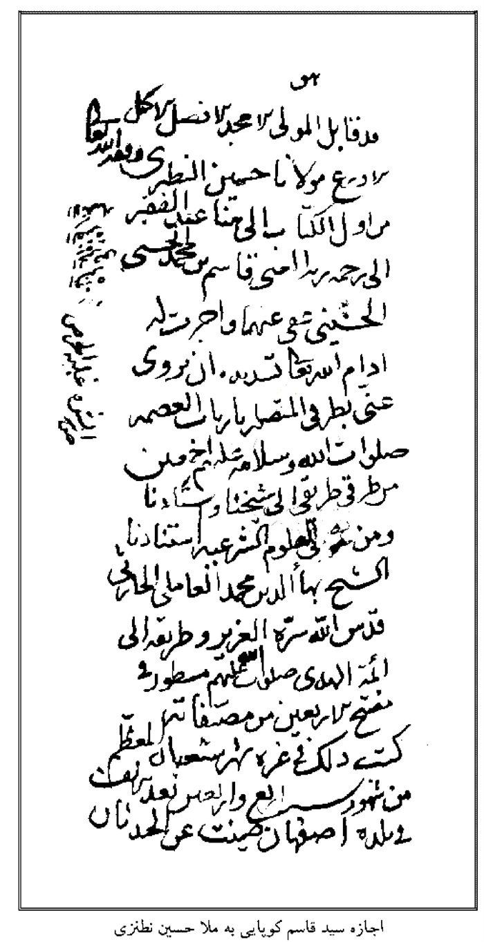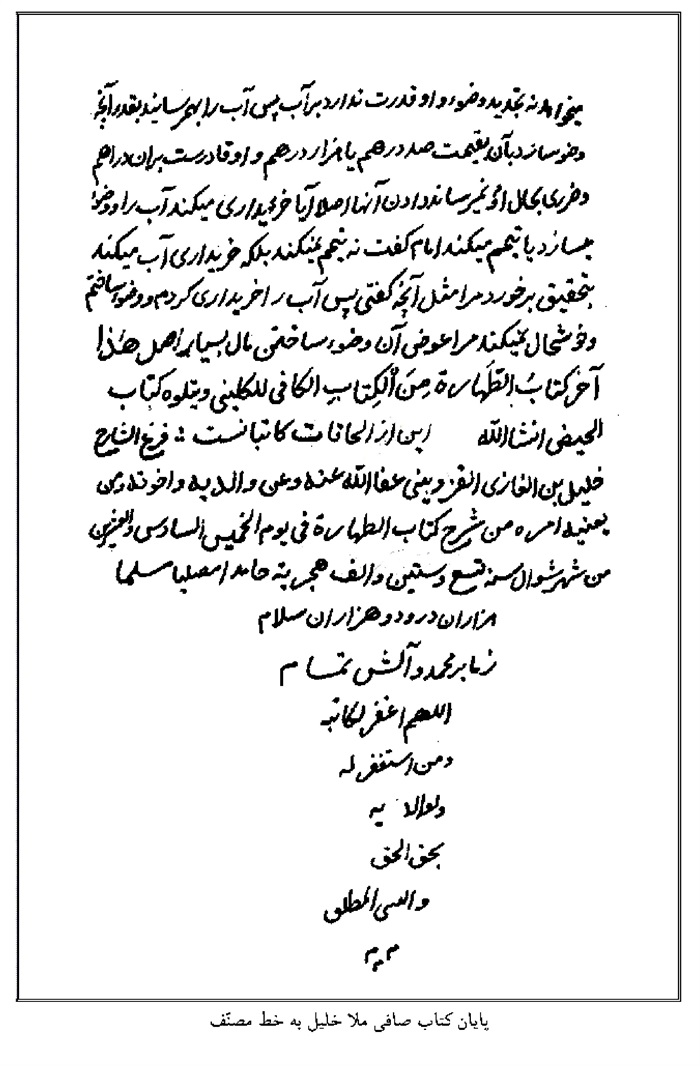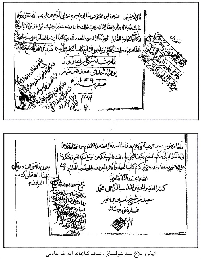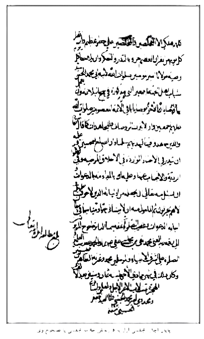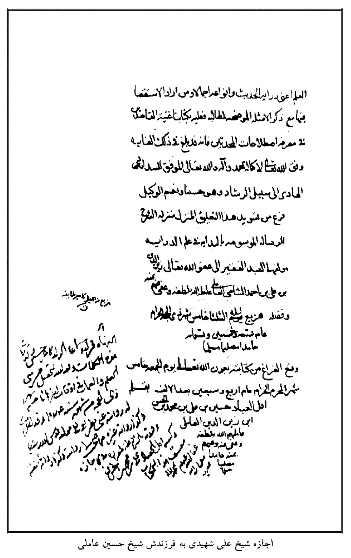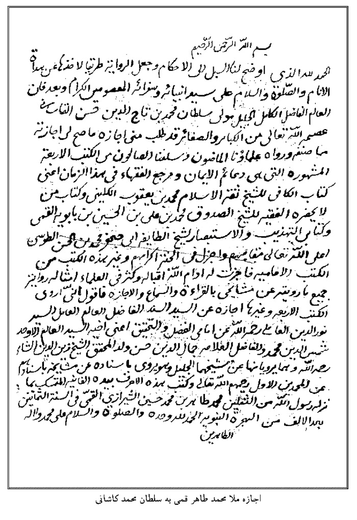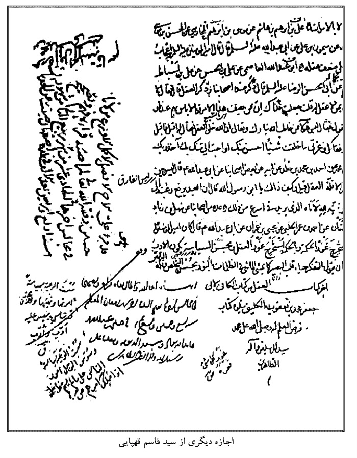 فليرو الولد الأعزّ، أدام الله تبارك وتعالي تأييداته وتوفيقاته، هذه الكتب وغيرها ممّا لم أذكره اختصاراً، من الكتب التي صنّف في الإسلام، سيّما كتب التفاسير والأحاديث عنّي. وآخذ عليه ما أخذ عليّ من الاحتياط في الرواية والفتوي،