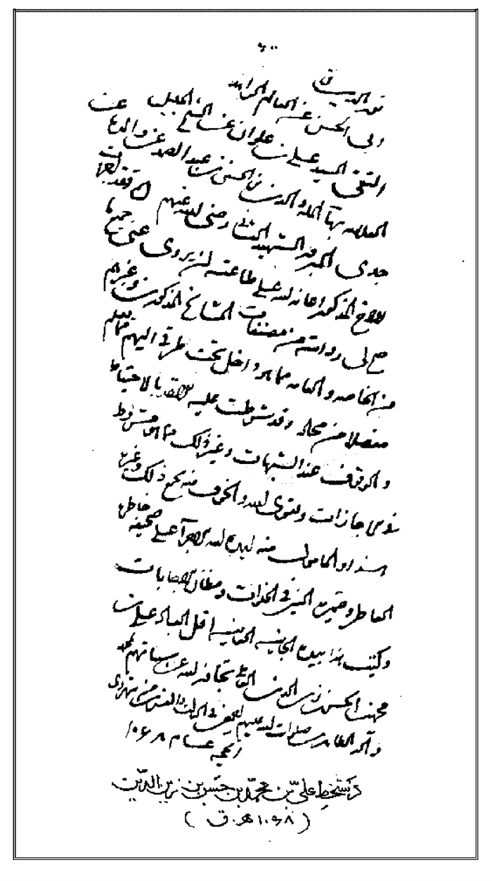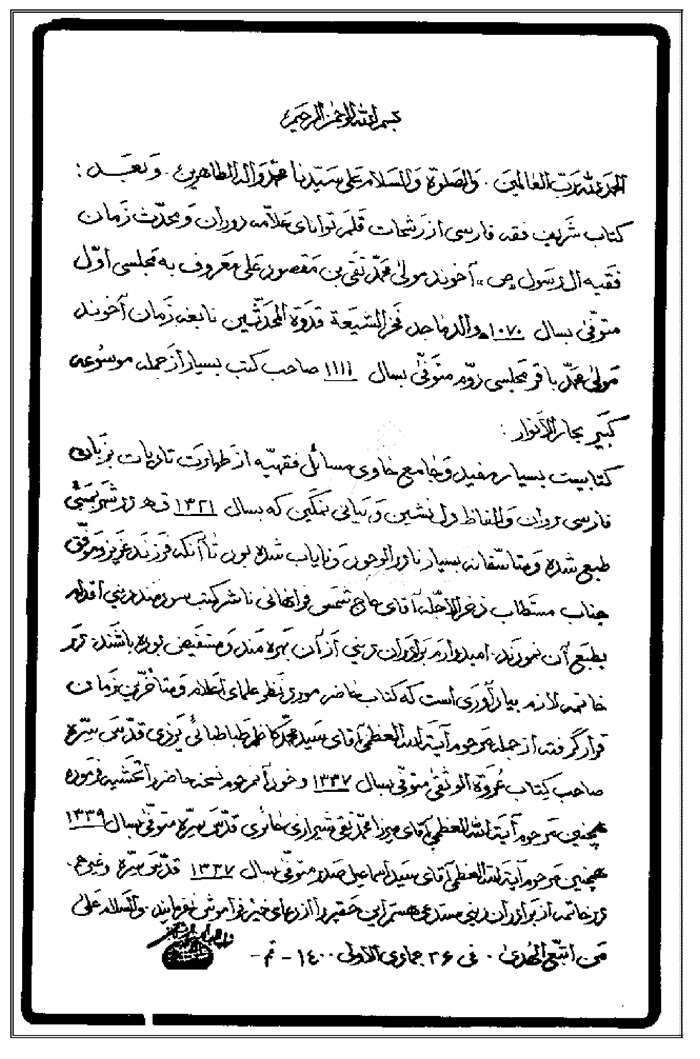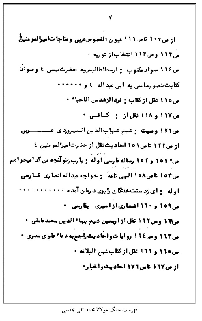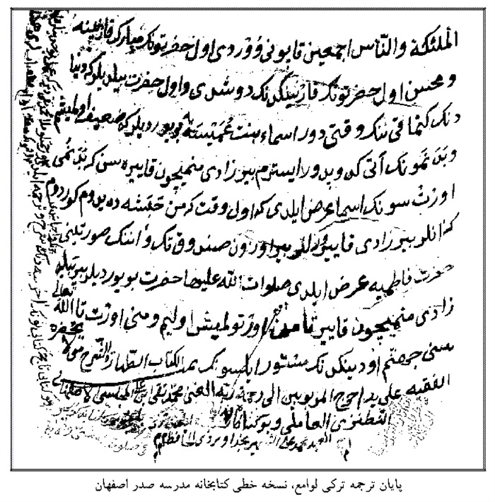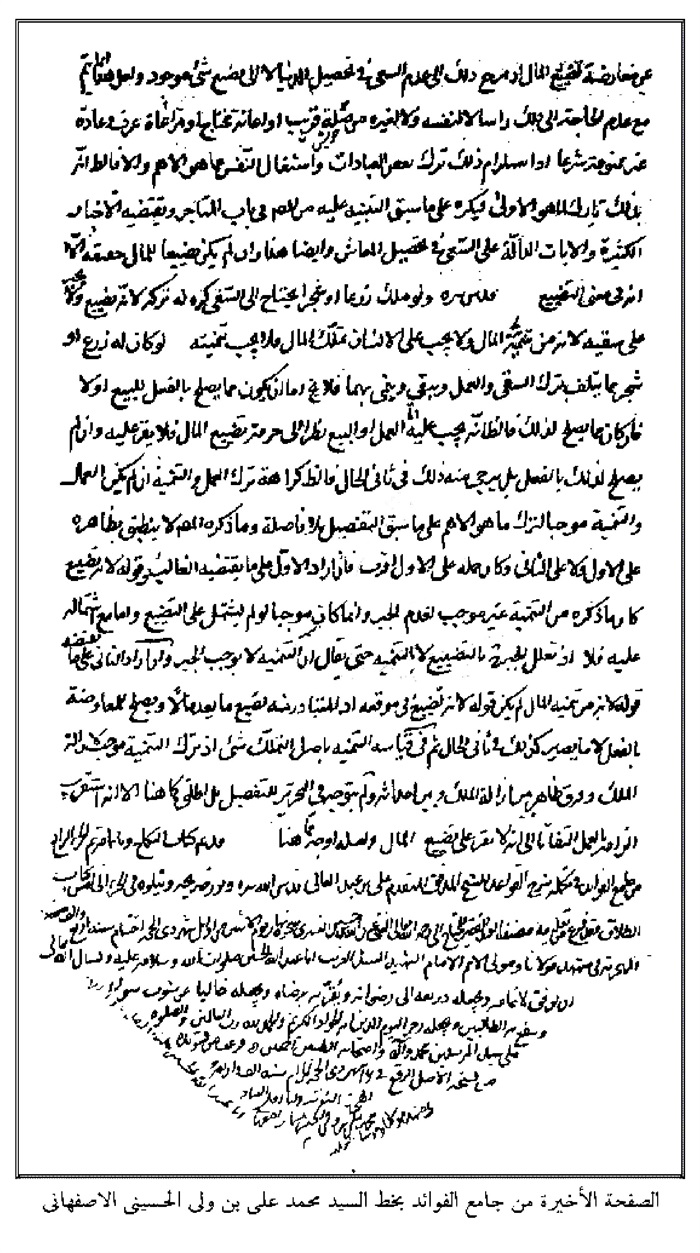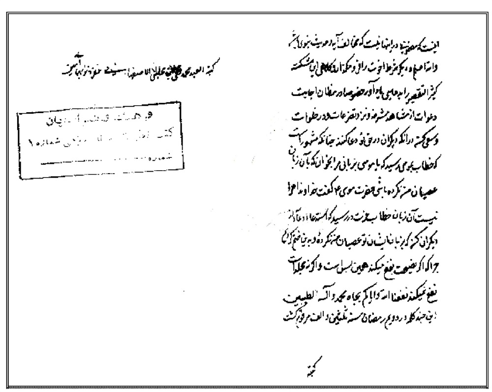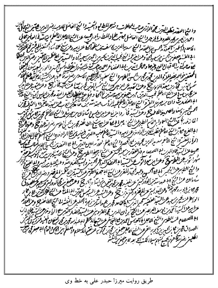 فليرو الولد الأعزّ، أدام الله تبارك وتعالي تأييداته وتوفيقاته، هذه الكتب وغيرها ممّا لم أذكره اختصاراً، من الكتب التي صنّف في الإسلام، سيّما كتب التفاسير والأحاديث عنّي. وآخذ عليه ما أخذ عليّ من الاحتياط في الرواية والفتوي،
