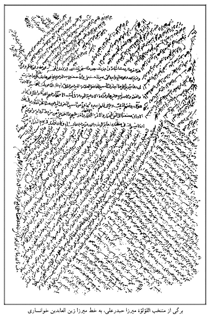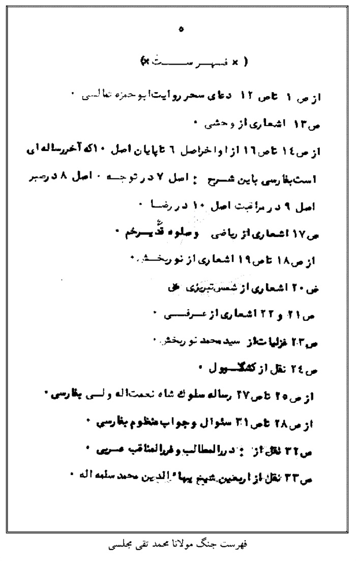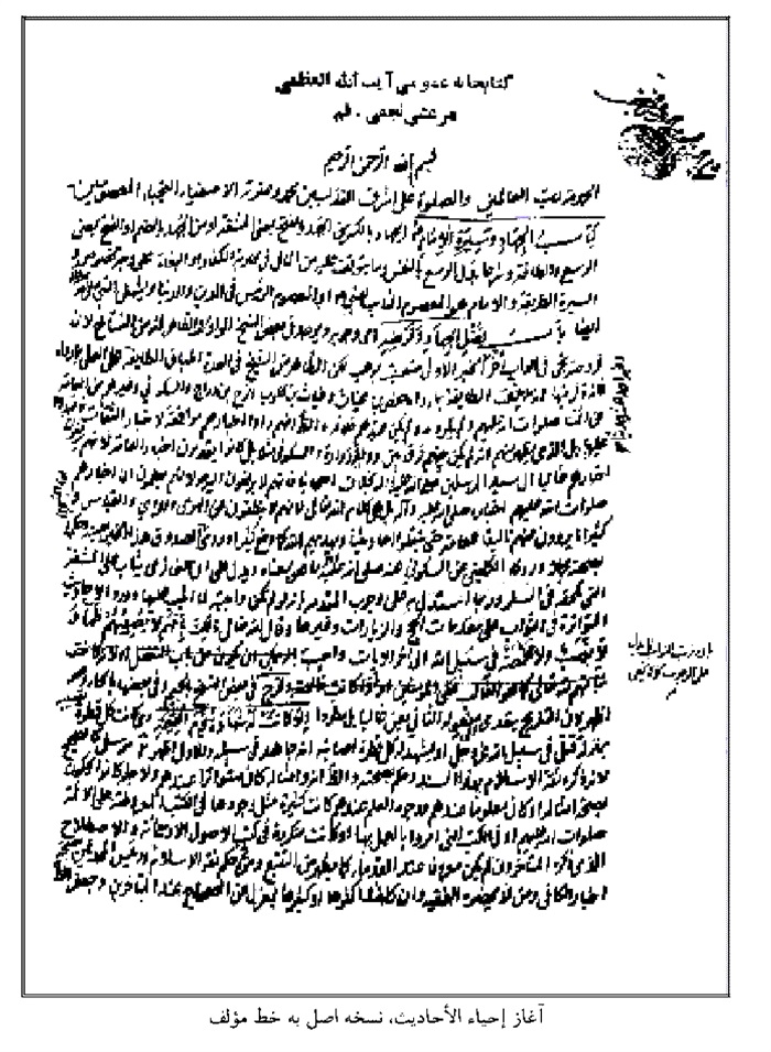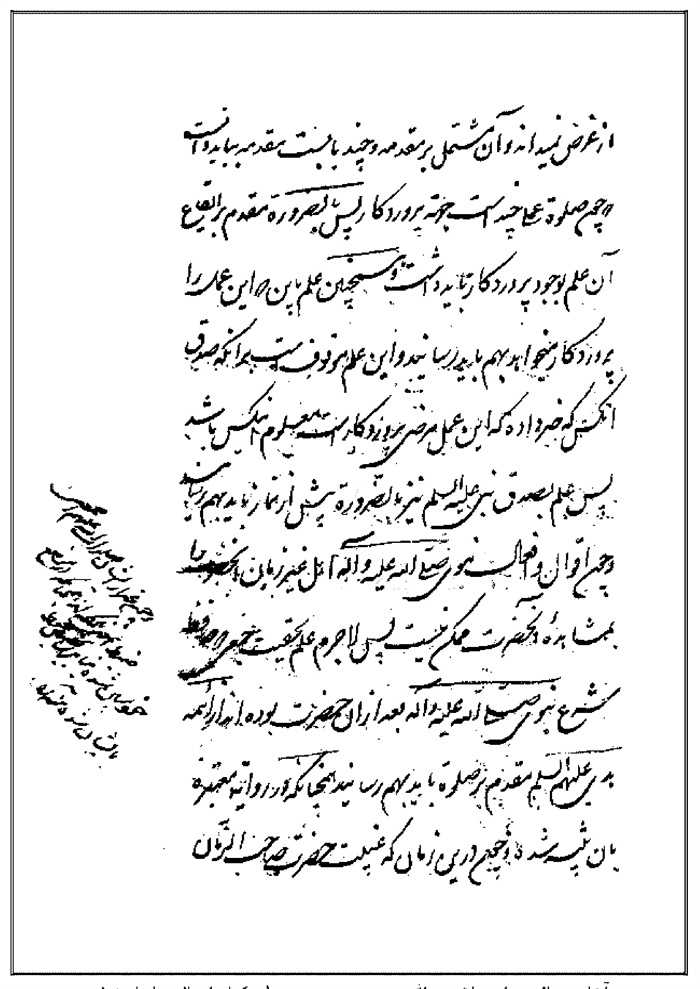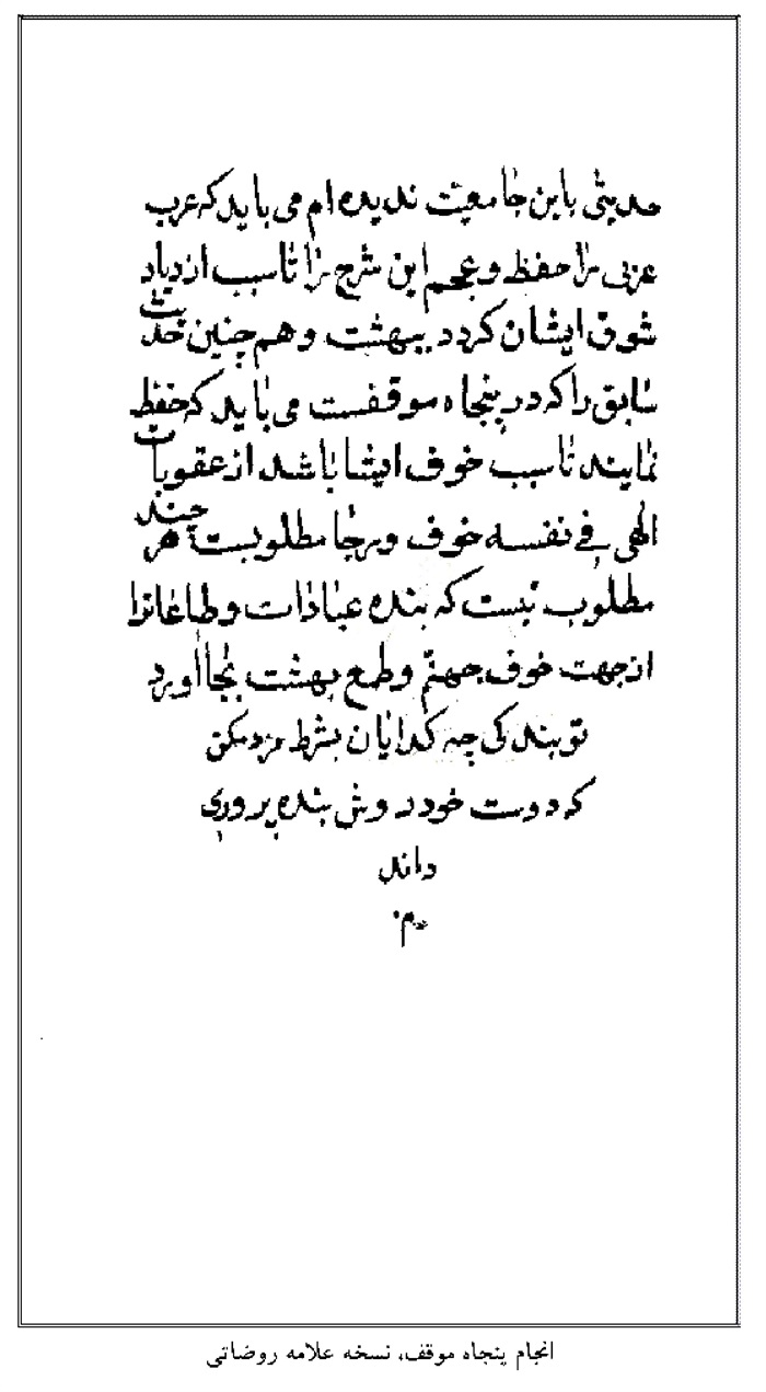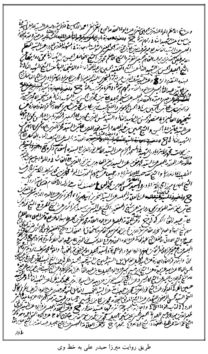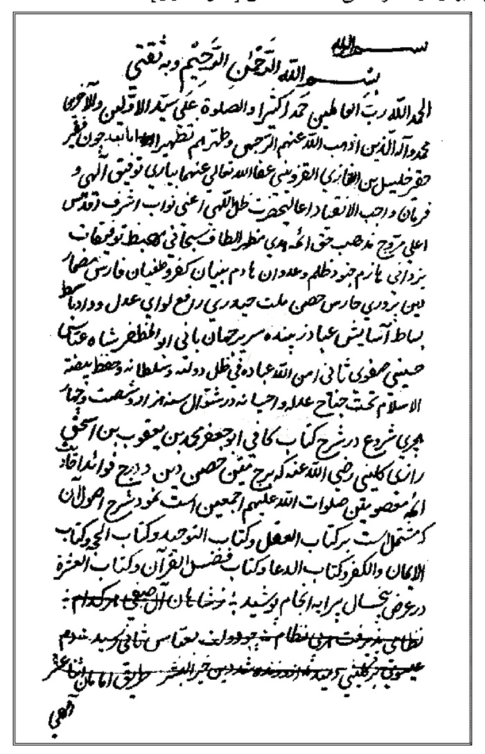 فليرو الولد الأعزّ، أدام الله تبارك وتعالي تأييداته وتوفيقاته، هذه الكتب وغيرها ممّا لم أذكره اختصاراً، من الكتب التي صنّف في الإسلام، سيّما كتب التفاسير والأحاديث عنّي. وآخذ عليه ما أخذ عليّ من الاحتياط في الرواية والفتوي،