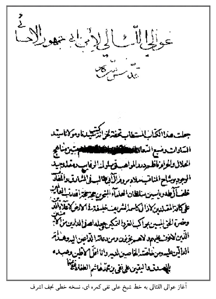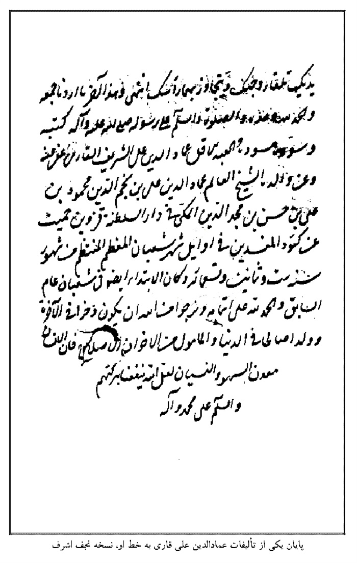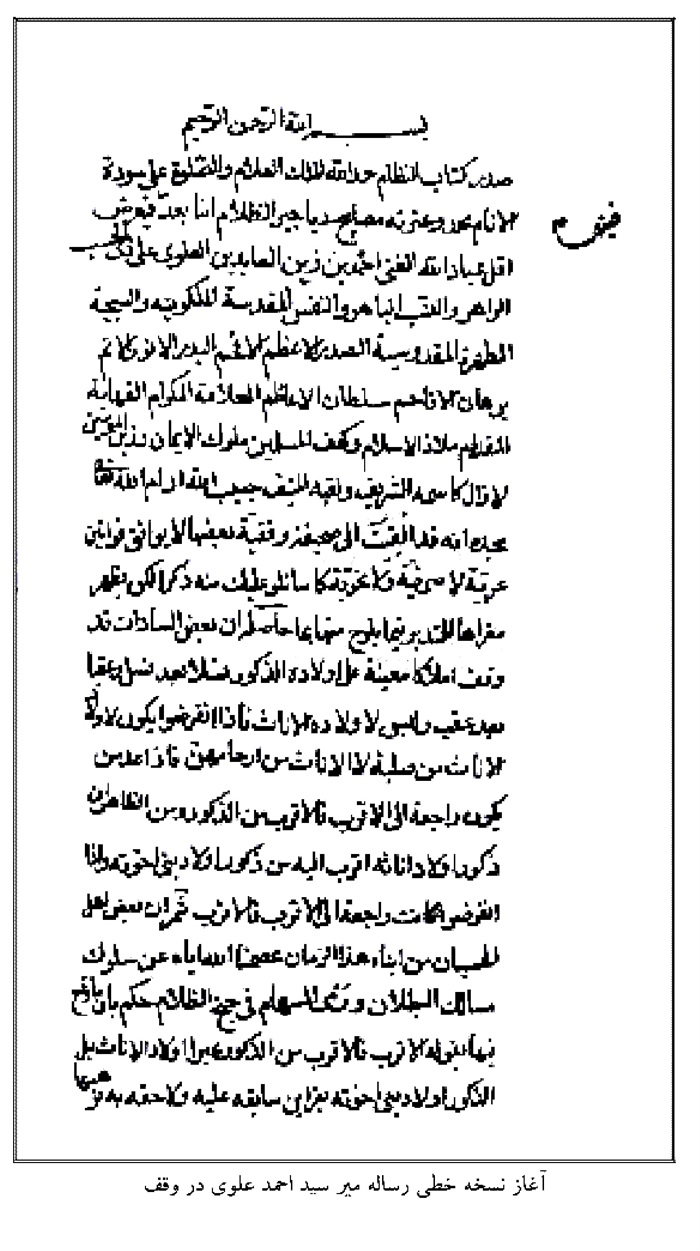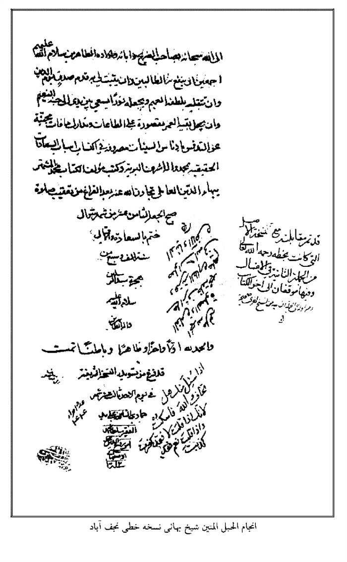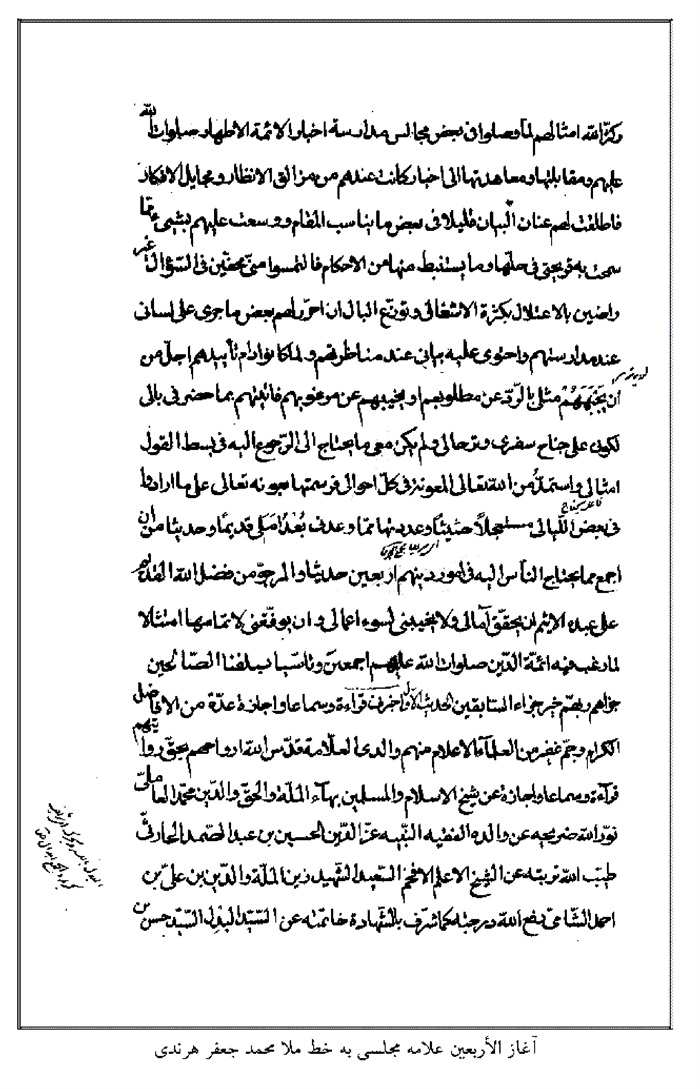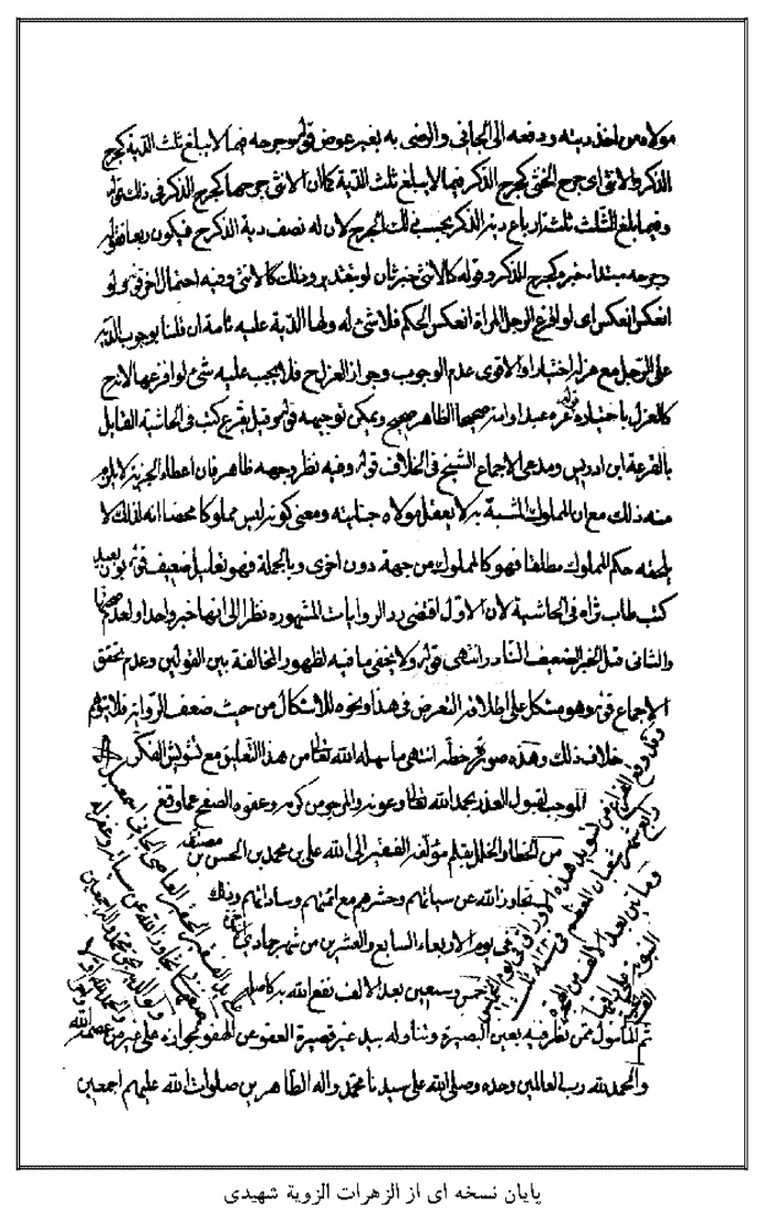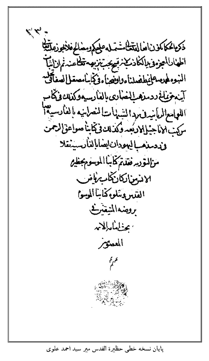 فليرو الولد الأعزّ، أدام الله تبارك وتعالي تأييداته وتوفيقاته، هذه الكتب وغيرها ممّا لم أذكره اختصاراً، من الكتب التي صنّف في الإسلام، سيّما كتب التفاسير والأحاديث عنّي. وآخذ عليه ما أخذ عليّ من الاحتياط في الرواية والفتوي،