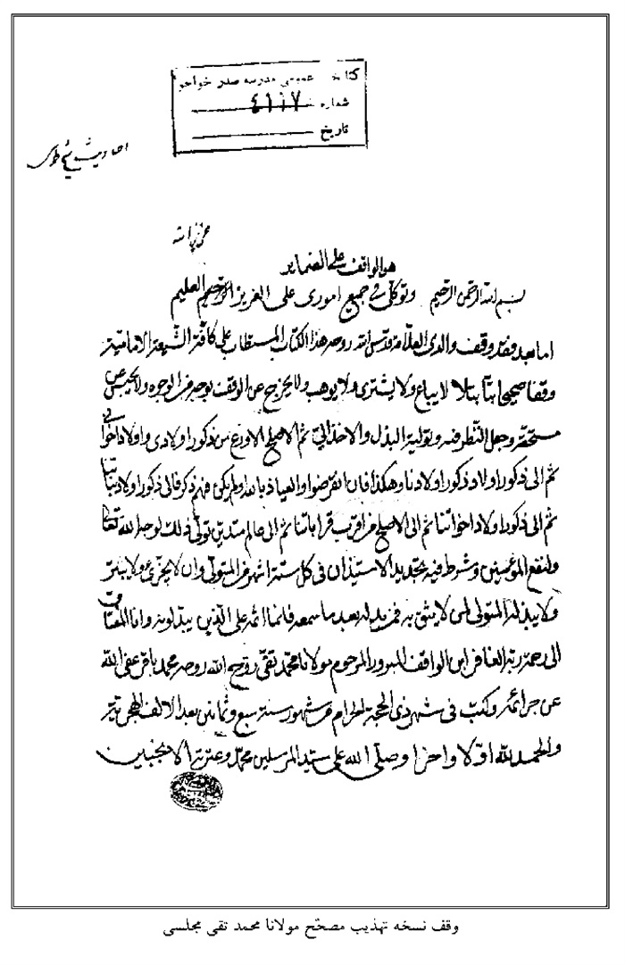 است، پنجم: حليله ميرزا نور الدين محمد مشكى، ششم: زوجه مرحوم حاجى محمّد كاظم قهپايه اى كه الحال كه هفتم شهر شوال 1217 است موجود است.(1)